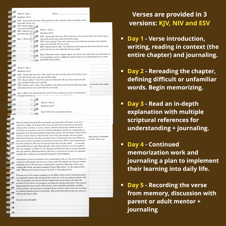 - – Day 5: Recording the verse from memory, discussion with parent or adult mentor + journaling