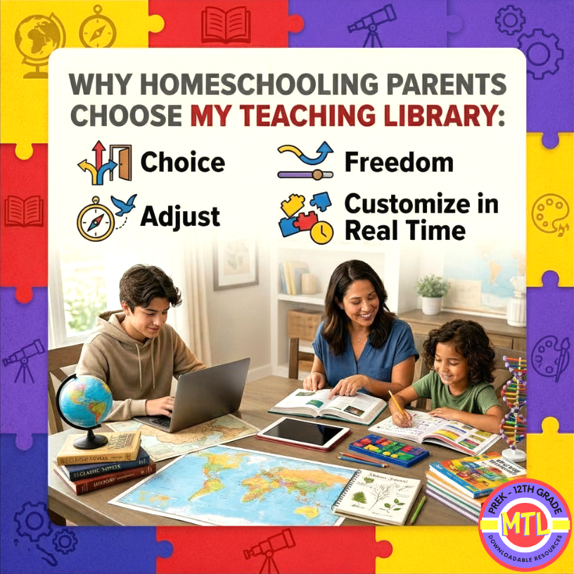 Every homeschooling parent knows the “perfect” curriculum doesn’t exist—at least, not in a single box. One child might be a math whiz but struggle with handwriting; another might be ready for high school science while still mastering middle school grammar. When you’re forced to stick to a rigid, one-size-fits-all program, you end up with two things: frustrated kids and burnt-out parents. My Teaching Library was created to change that. Owned and curated by a veteran classroom teacher and homeschooling mom with 30+ years of experience, My Teaching Library gives you the ultimate freedom to pivot, adjust, and customize your child’s education in real-time.