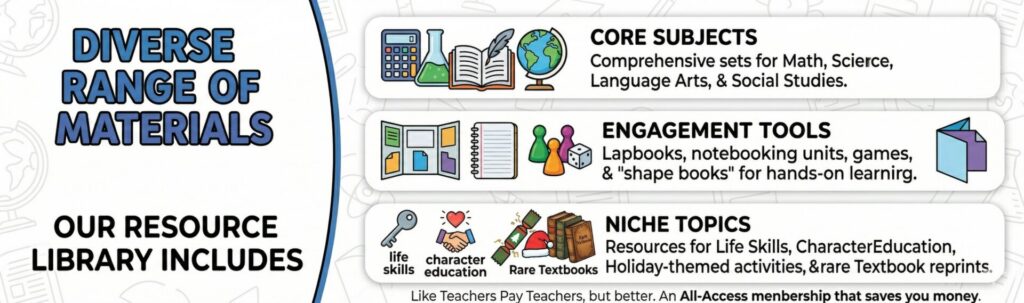 - Zero Price Tags: For members, every resource is listed at $0.00. No more “budgeting” for every individual worksheet or unit study.