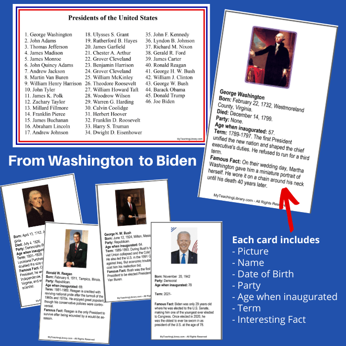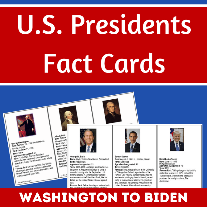 Studying the U.S. Presidents, U.S. History, or U.S. Government? These U.S. Presidents Fact Cards are perfect for students wanting to learn more about each president, from Washington to Biden. Also includes 2 blank templates to use for future presidents.