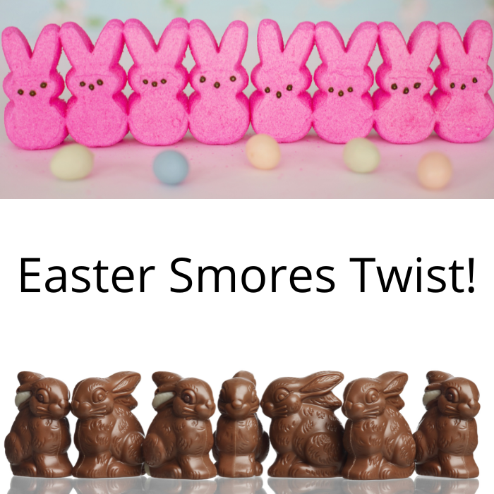 Just preheat the toaster oven or real oven, lay out a graham cracker. Break up your chocolate bunnies and place a few of the pieces on top of the graham cracker. Top with a peep and pop it in the oven.